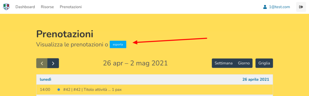 Per esportare le prenotazioni è sufficiente andare nel calendario prenotazioni e cliccare sul tasto esporta. Verrà generato un csv con le prenotazioni di tutto l’anno in corso.