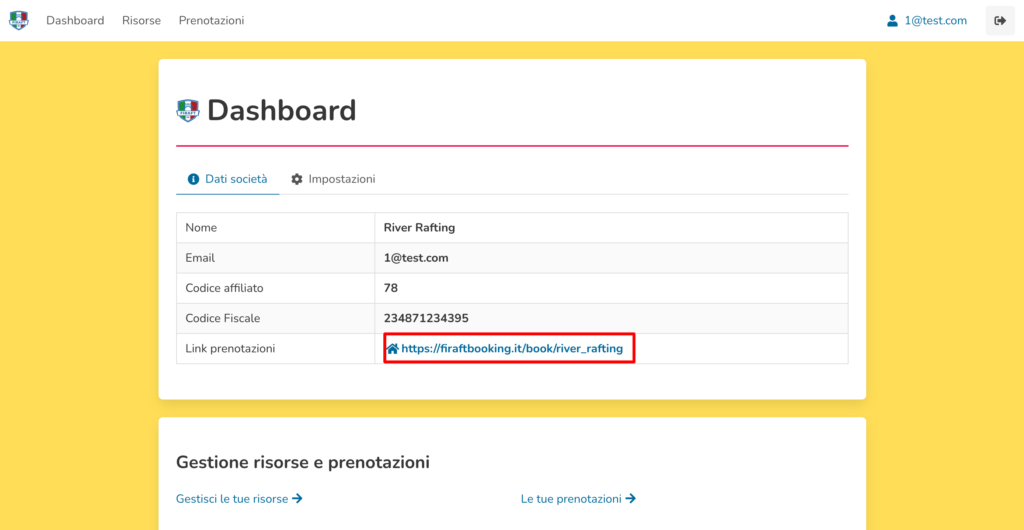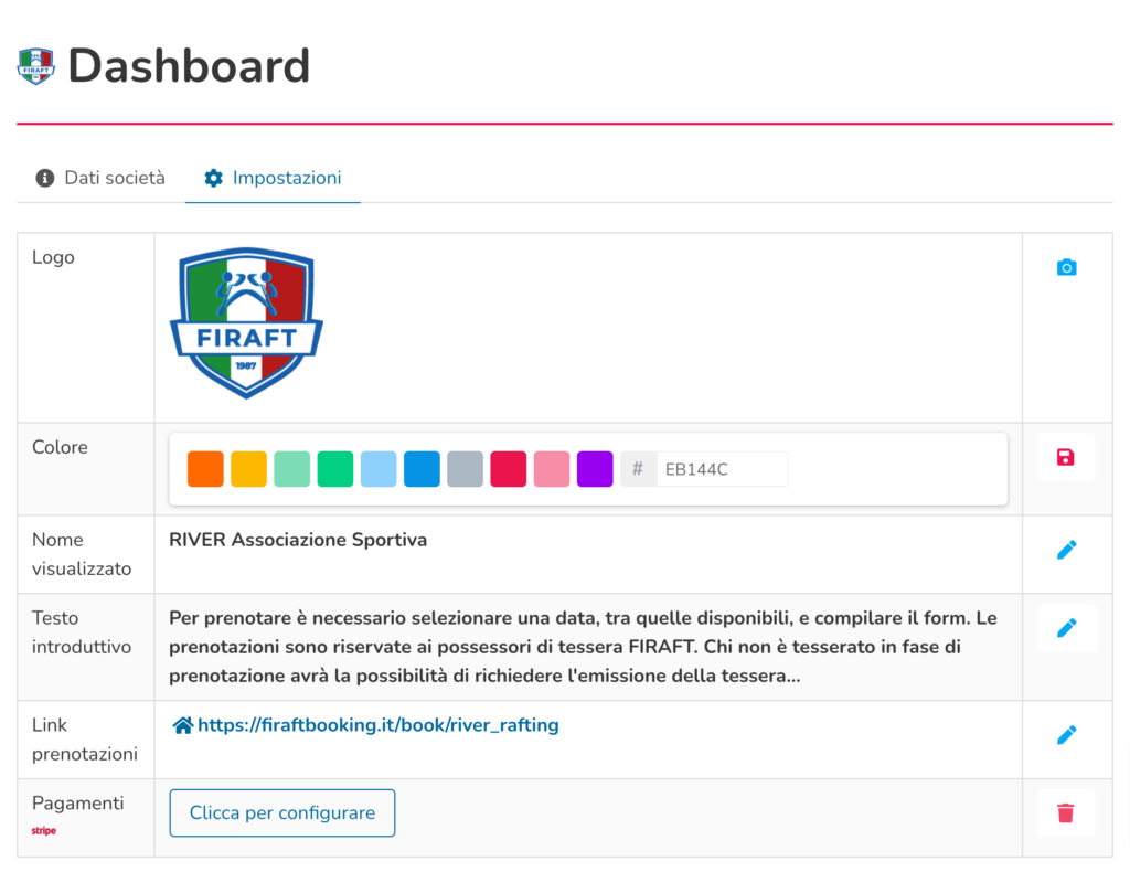 - Link prenotazioni: permette di modificare il link per accedere al calendario prenotazioni.