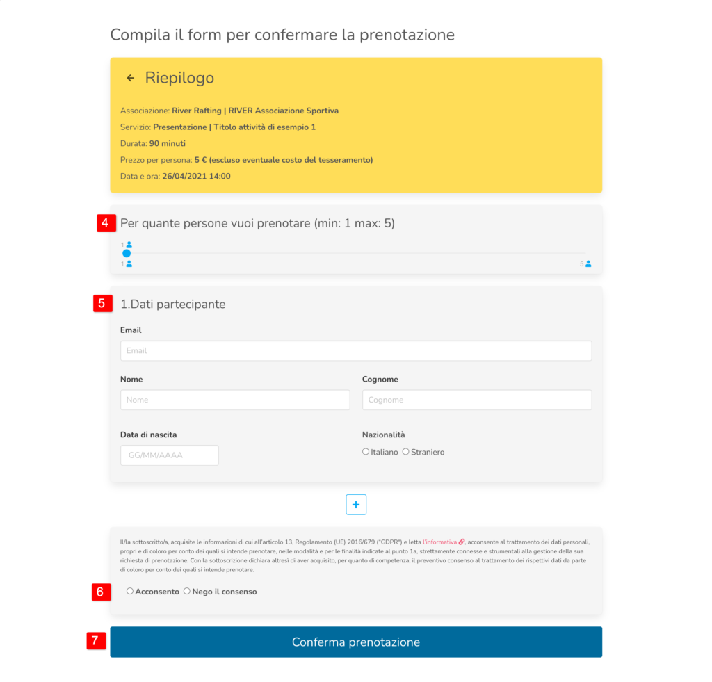 - Scegliere il numero di persone (minimo e massimo definito dall’associazione)