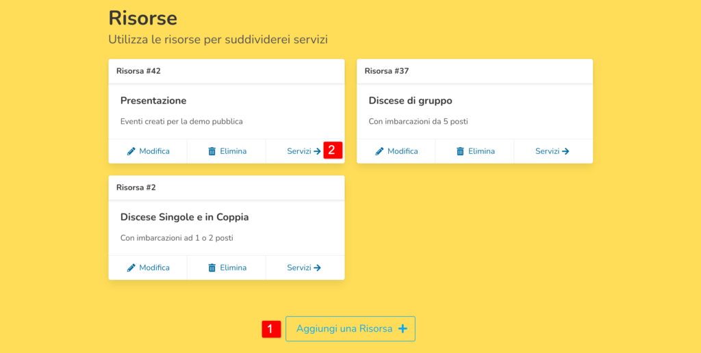 Una risorsa consiste in due valori: un titolo ed una descrizione, i dati inseriti saranno visibili nel calendario prenotazioni.