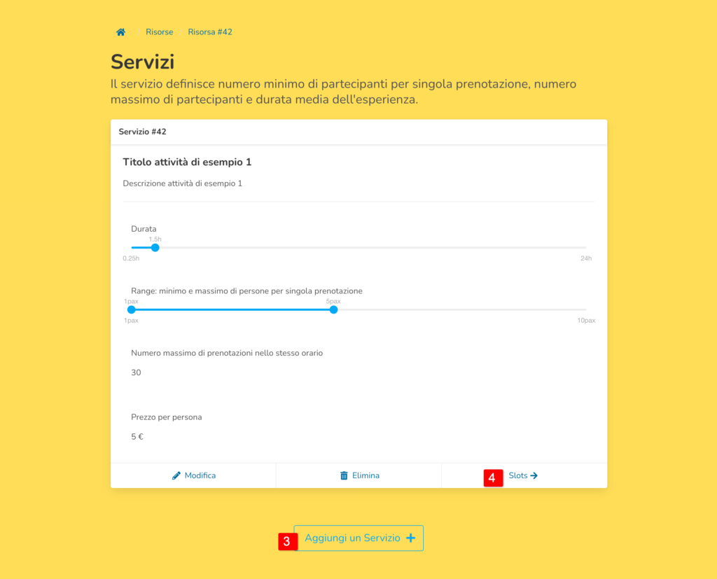 Ogni servizio necessita di almeno uno slot. Lo slot definisce le date e gli orari di svolgimento dell’attività.