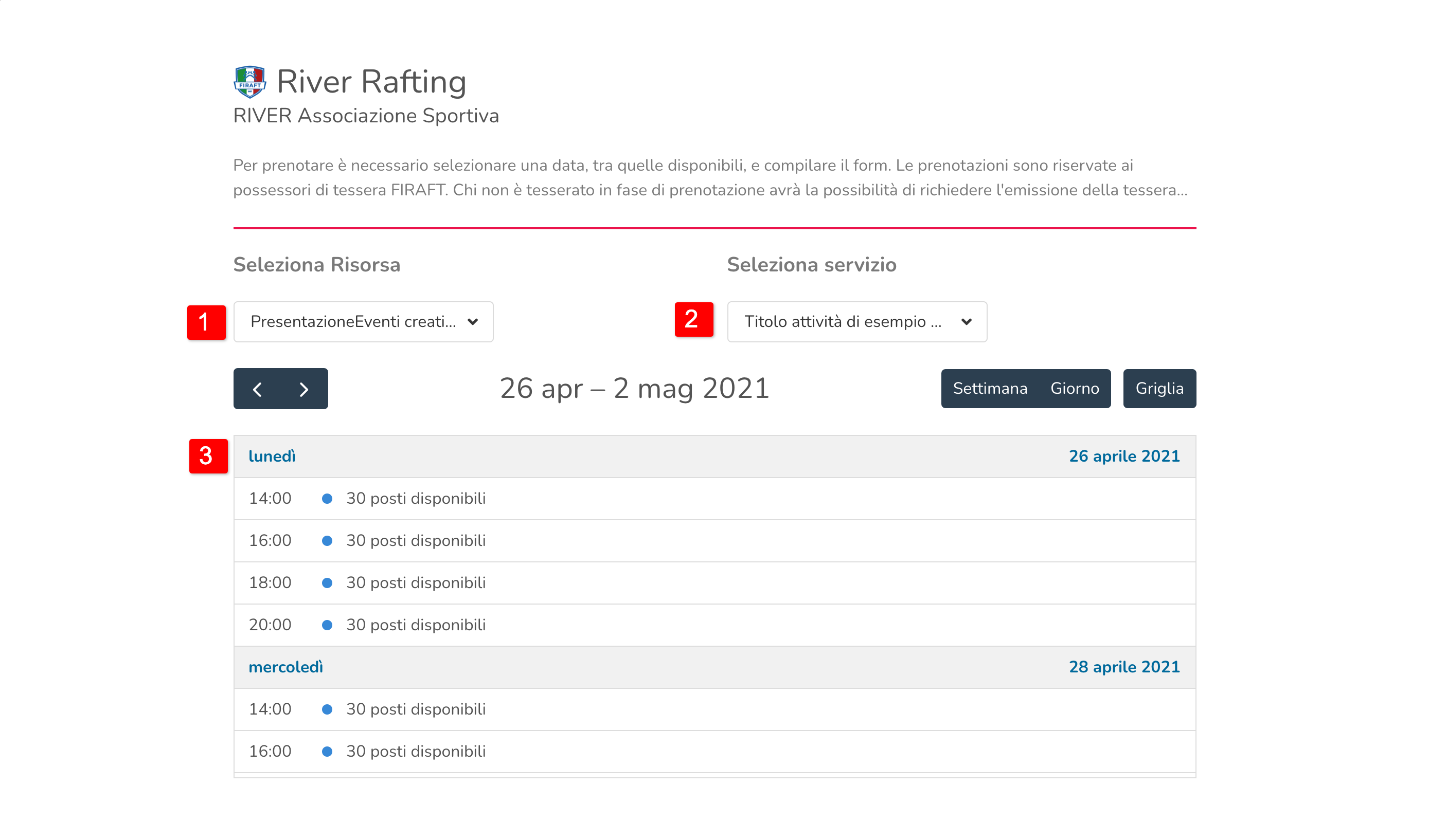 Ogni servizio necessita di almeno uno slot. Lo slot definisce le date e gli orari di svolgimento dell’attività.