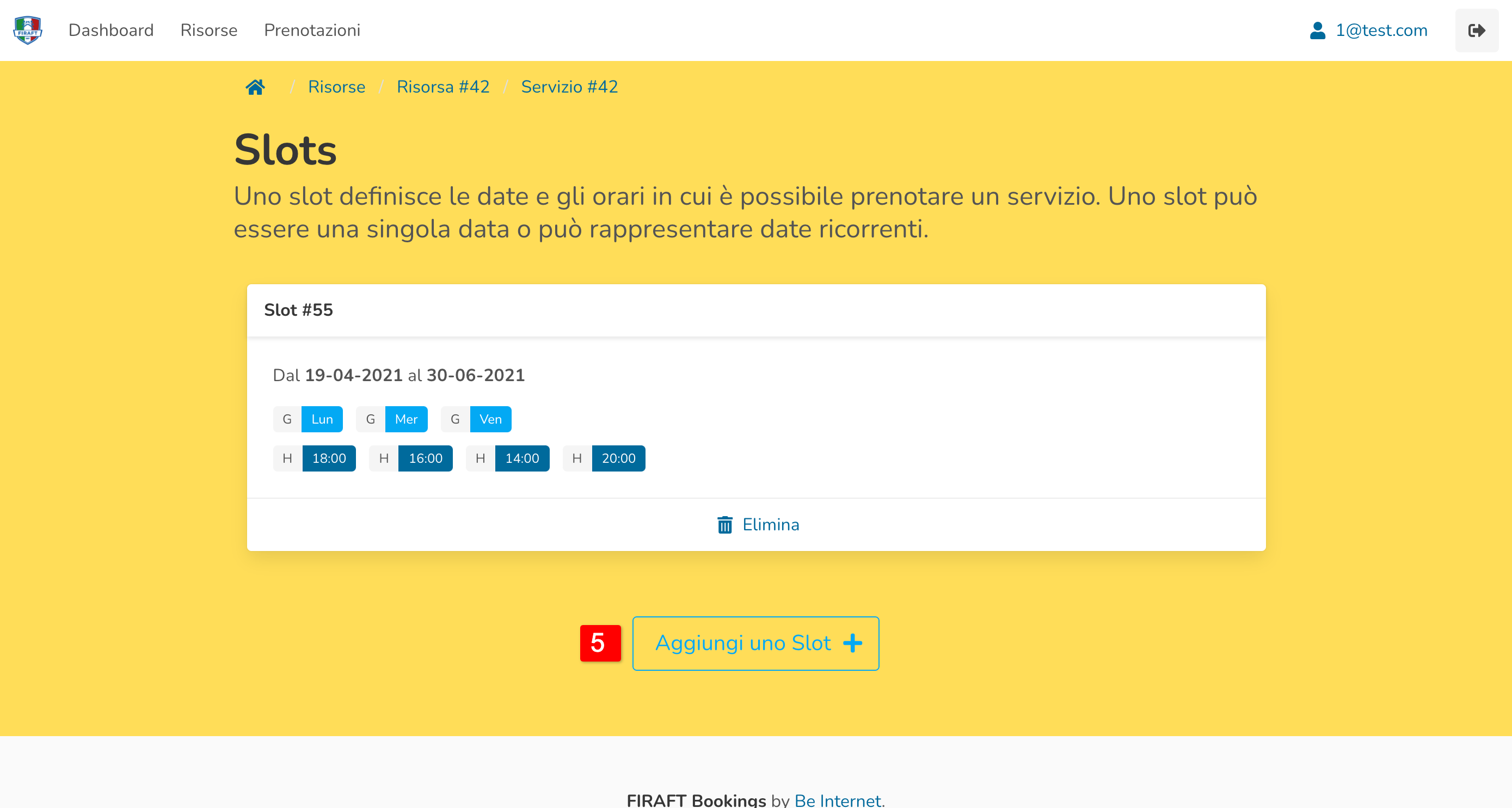 - Tasto di aggiunta slot: si aprirà una modale per l’inserimento dei dettagli.